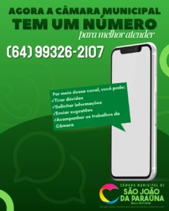A Câmara Municipal de São João da Paraúna agora conta com um novo número de atendimento para melhor atender você.Por meio desse canal, o cidadão pode tirar dúvidas, solicitar informações, enviar sugestões e acompanhar de perto os trabalhos do Legislativo. 📲 Entre em contato pelo número:(64) 99326-2107 Mais proximidade, transparência