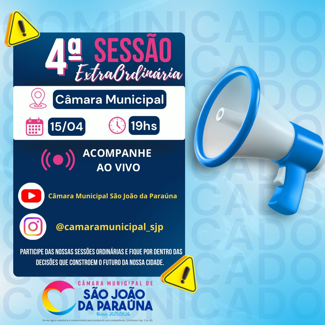 📅 Calendário das Sessões Plenárias de 2026 Câmara Municipal de São João da Paraúna A Câmara Municipal de São João da Paraúna divulga o calendário oficial das Sessões Plenárias para o ano de 2026.As sessões plenárias são momentos fundamentais para o debate, a deliberação e a construção de políticas públicas
